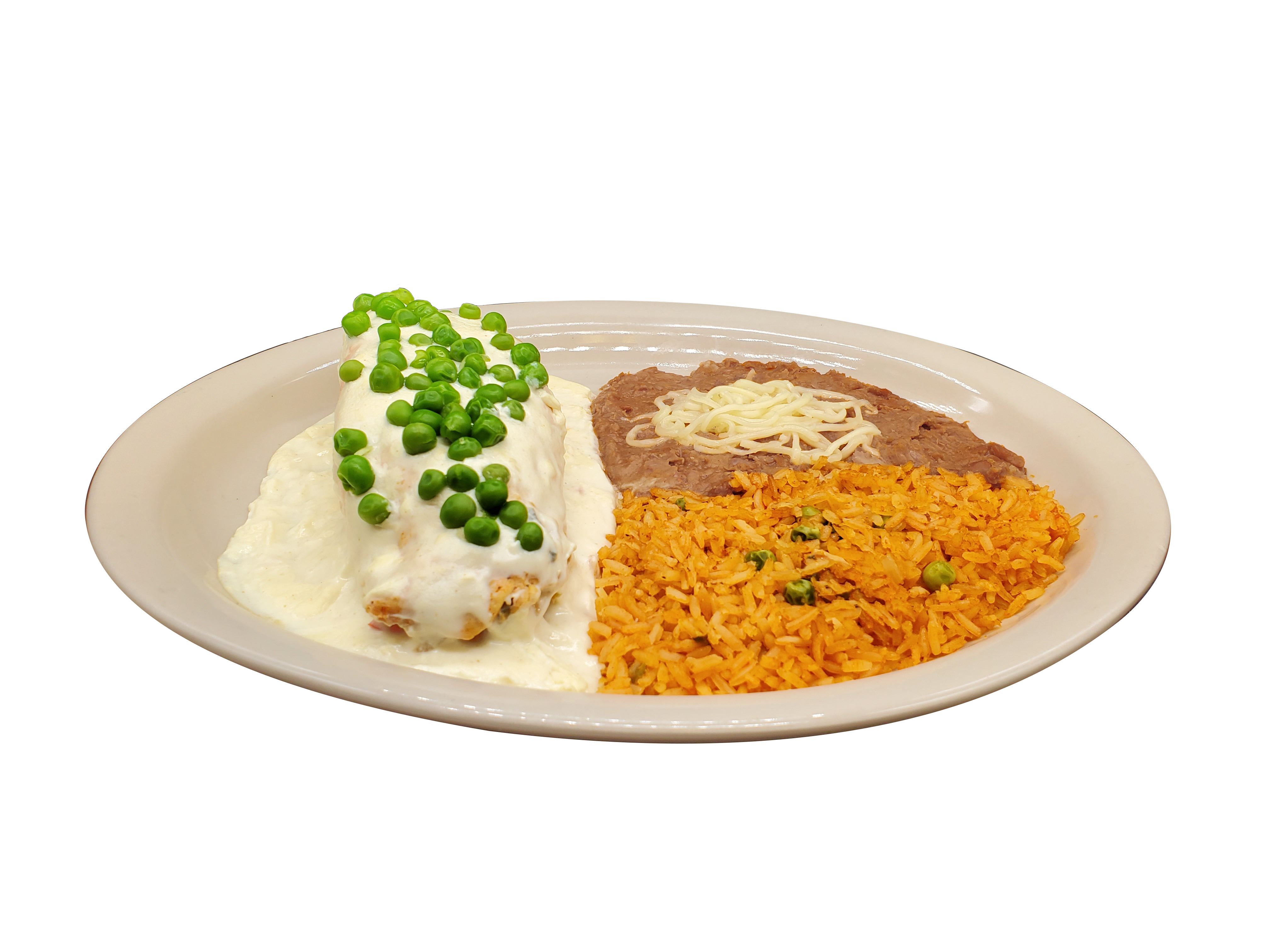 Grilled chicken breast stuffed with onion, bell peppers, mushrooms, carrots and jack cheese. Topped with sour cream sauce and green peas. Served with rice and beans.